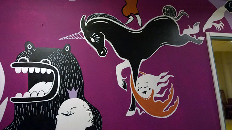 ”Projekti starttasi naistenpäivänä 8.3., kun kävimme esittäytymässä tytöille ja tuolloin vielä valkoiseen seinään kiinnitettiin iso paperi, johon kuka tahansa sai kirjata toiveensa seinämaalauksesta. Suunnittelimme maalauksen näiden toiveiden pohjalta: Tytöt halusivat seinälle dinosauruksia, monstereita, hain, yksisarvisia… he myös kielsivät vaaleanpunaisen värin käytön.”